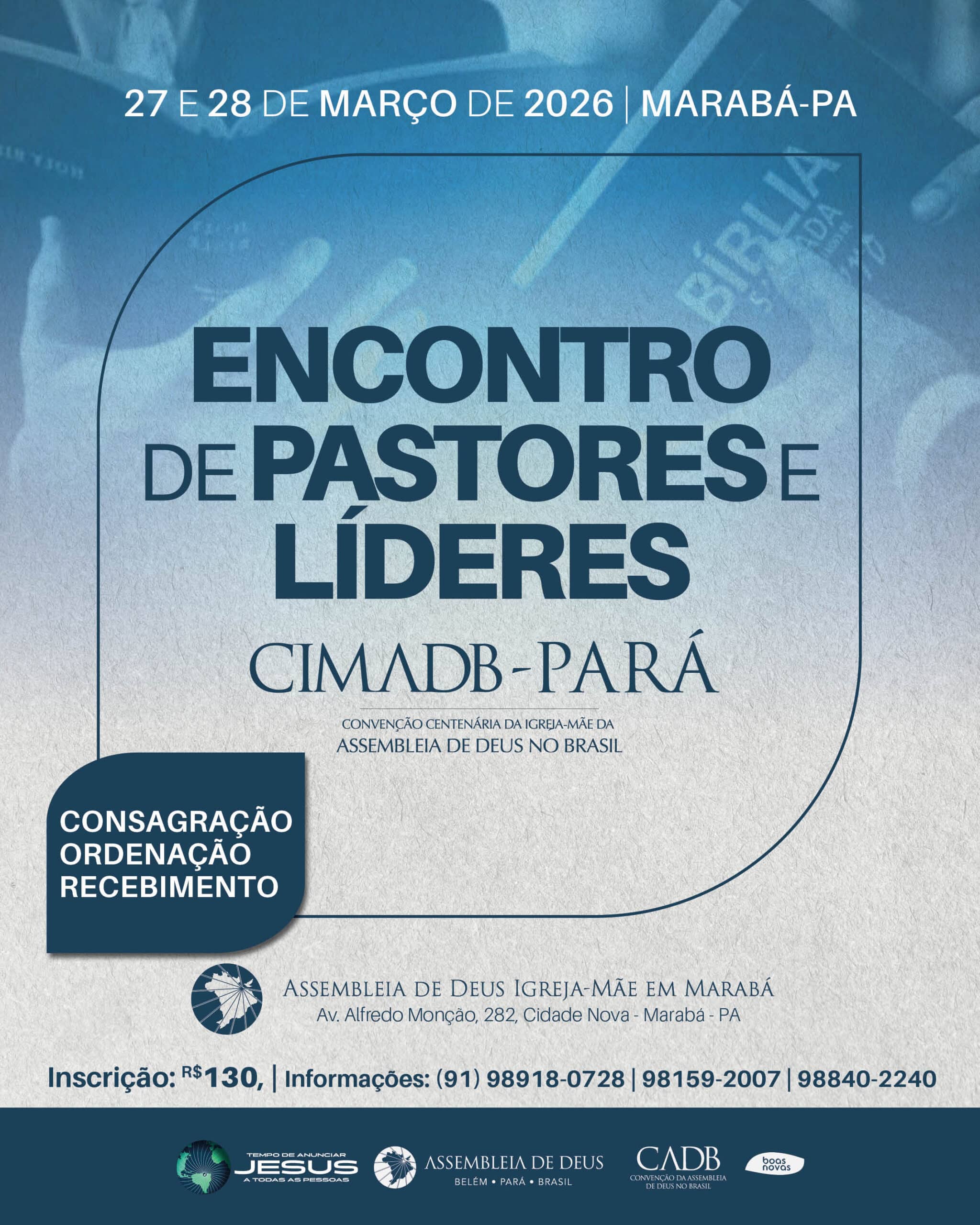 Nos dias 27 e 28 de março, a cidade de Marabá, no Pará, sediará o primeiro Encontro de Pastores e Líderes de 2026, um tempo especial de comunhão, alinhamento ministerial e fortalecimento da missão da Igreja. O encontro terá como tema “Tempo de anunciar Jesus a todas as pessoas”, reforçando o chamado urgente de proclamar o Evangelho em nossa geração.